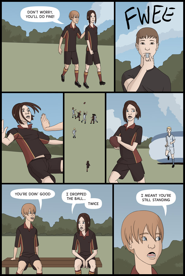 Yiangos Well, in page 146, Ash is inviting Sam to join her "footy" team, and Sam mentions how "good" he is at soccer. Indeed we've seen him take a soccer ball to the **ahem** area a few pages before that. I guess it's safe to say that if they were going to play soccer, Ash wouldn't say "footy" team, but "soccer" team.